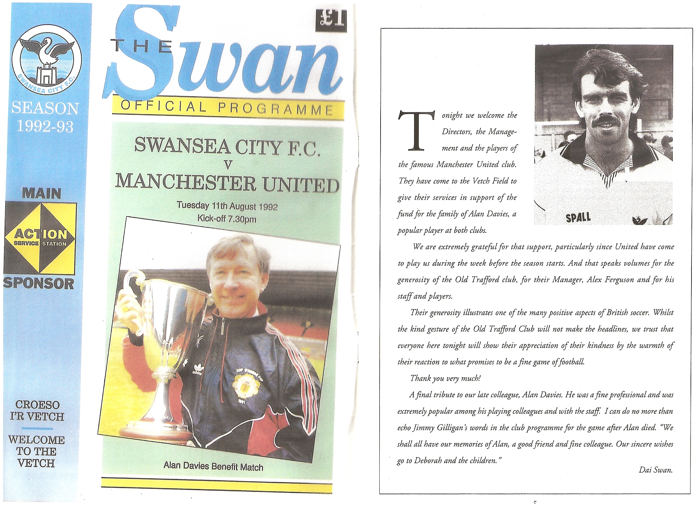 I have been reminded that Alan Davies died twenty years ago today when, tragically, he took his own life at the age of 30. An elegent and creative midfielder, Alan made 127 appearances for the Swans in two spells at the club between 1987 and 1992. He began his career at Manchester United, for whom he appeared in the two games of the FA Cup Final v Brighton in 1983 , and he went on to play for Newcastle United. He won 13 Welsh caps. Alan’s death was a great blow to the club and its supporters, as well as to his family and friends, and it was entirely fitting and appropriate that a benefit game was played against Manchester United at the Vetch on 11 August 1992. As the note in the benefit match programme states, he was a very popular player who was much missed by many people connected with the club.