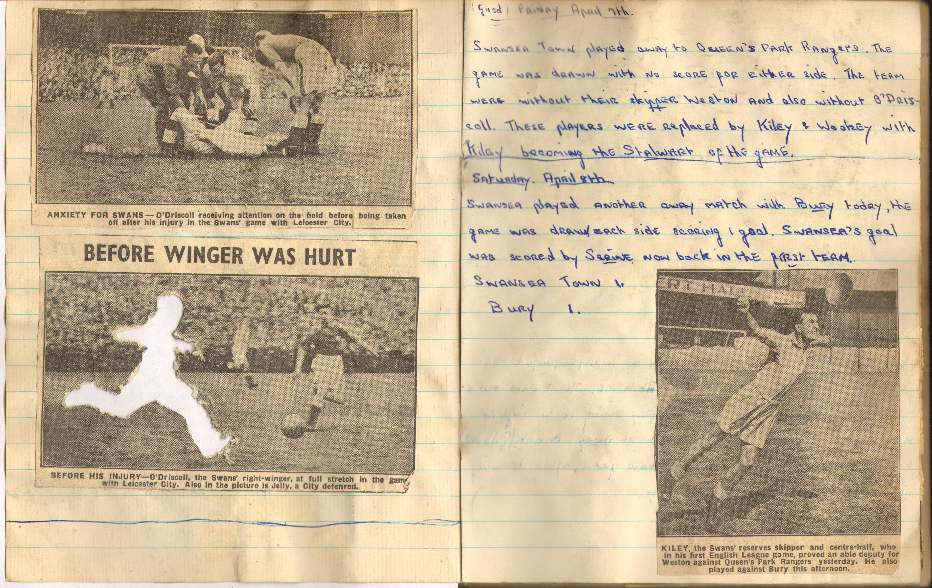Her notebook for players’ autographs: on the top right the pin given her by Swansea Town’s manager Frank Barson.