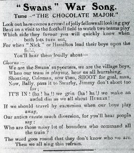 A recent discovery in the Swansea Library has revealed the first specially-written song for supporters to sing in praise of the Swans. The lyrics are contained in a magazine called The World of Sport, only one copy of which is known to survive (follow link to The World of Sport 1913)