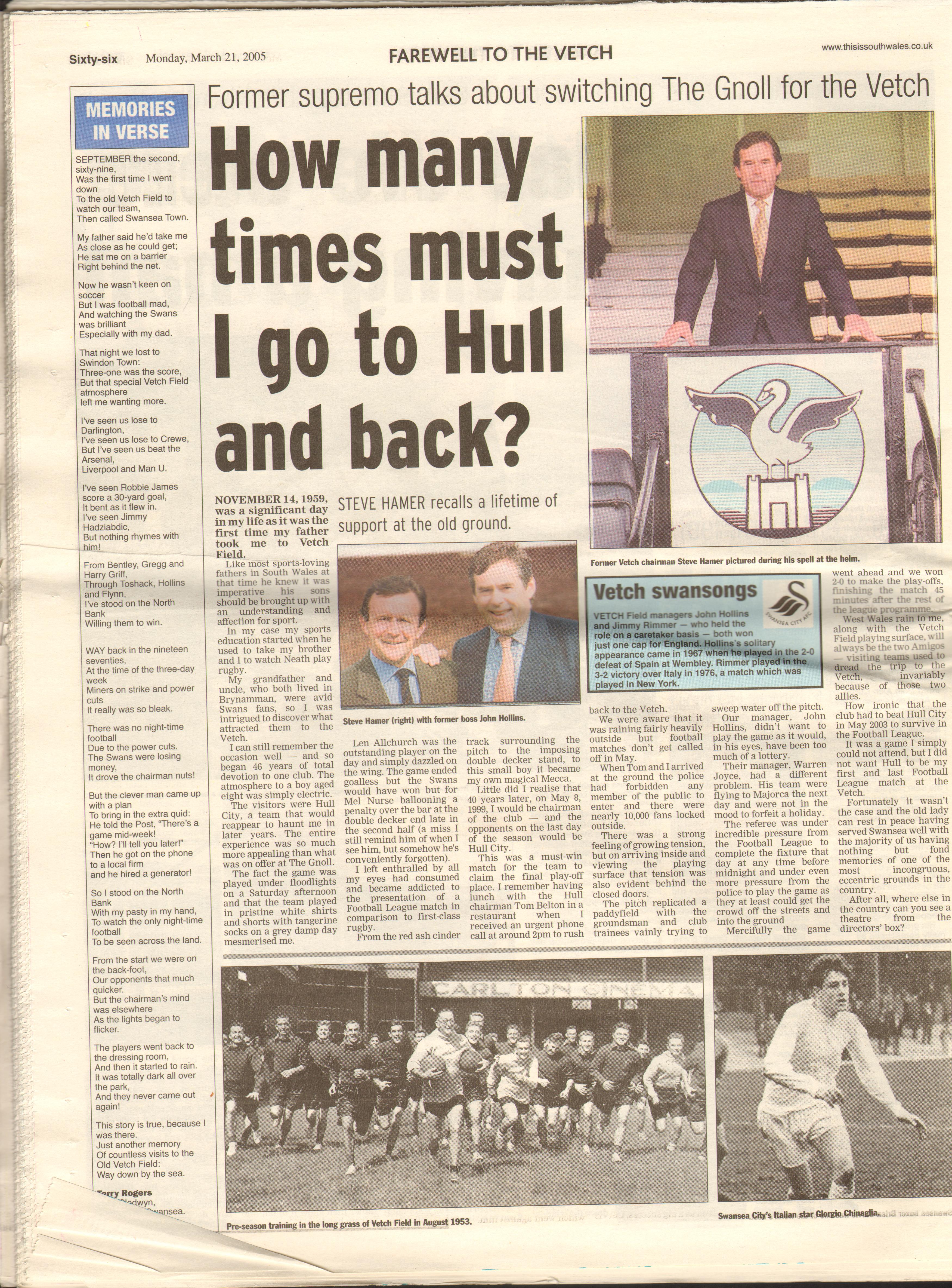 When I was 13, I enrolled on a coaching course which was run by Alan Williams, Vic Gomersall and Brian Evans.Every Wednesday Alan and Vic would pick me up in Alans Avenger and take me to Sketty Lane for an hours coaching. I particularly remember Vic being a lovely bloke,Alan a bit surly and Brian was very quiet.I know the current squad carry out some community duties but I cant see the modern professional footballer picking you up in their car.