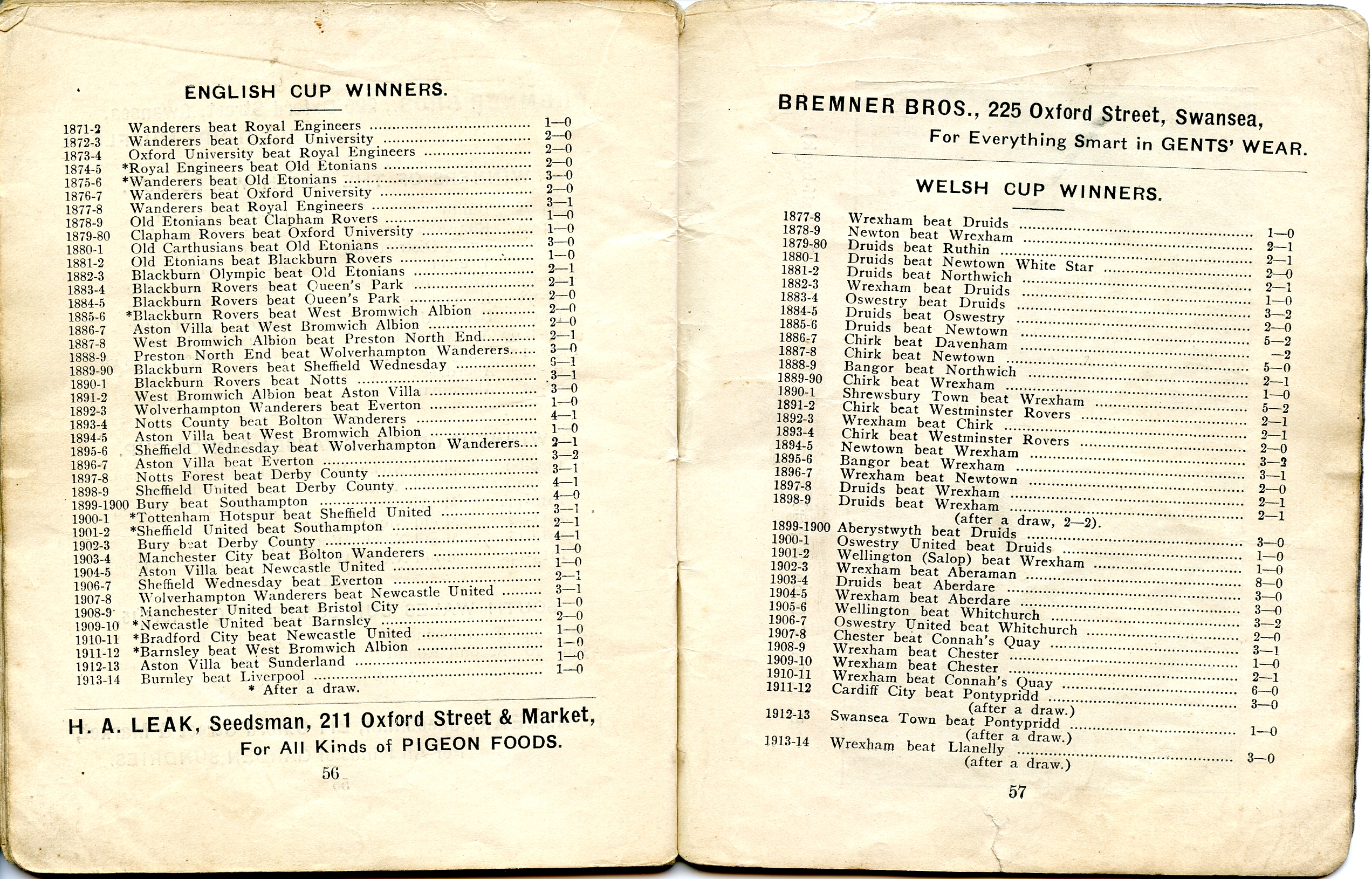 English Cup & Welsh Cup winners, up to 1914.