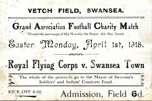 “Swansea Town met the Royal Flying Corps of Farnborough at Vetch Field. About 6,000 people attended. The proceeds are to be devoted to the Mayor’s Sailors’ and Soldiers’ Comfort Fund. Swansea scored first through Ivor Brown. Half time arrived with the score Swansea 1: R.F.C. 0. In the second half the Flying Corps scored 5 goals. Final score: R.F.C. 5; Swansea Town 1”
