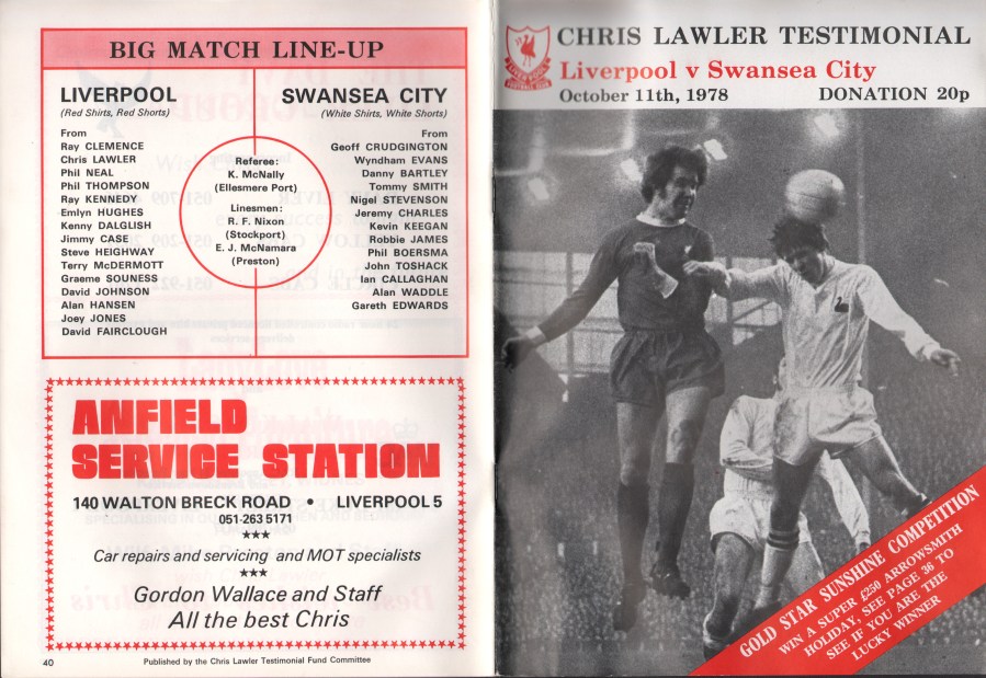 Programme and ticket for Chris Lawler testimonial – after Liverpool legend Tosh had moved to Swansea.