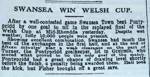 ‘The winning of the Welsh Cup by the Swansea Association team has incidentally had the effect of disclosing the large proportions already reached by the local supporters of the dribbling code and the intensity of the enthusiasm. Thousands of people waited in the dribbling rain for the home-coming of the players, and a huge procession accompanied the latter from the Rhondda and Swansea Bay Railway to the Hotel, where the time-honoured custom of ”filling the cup” was observed.’