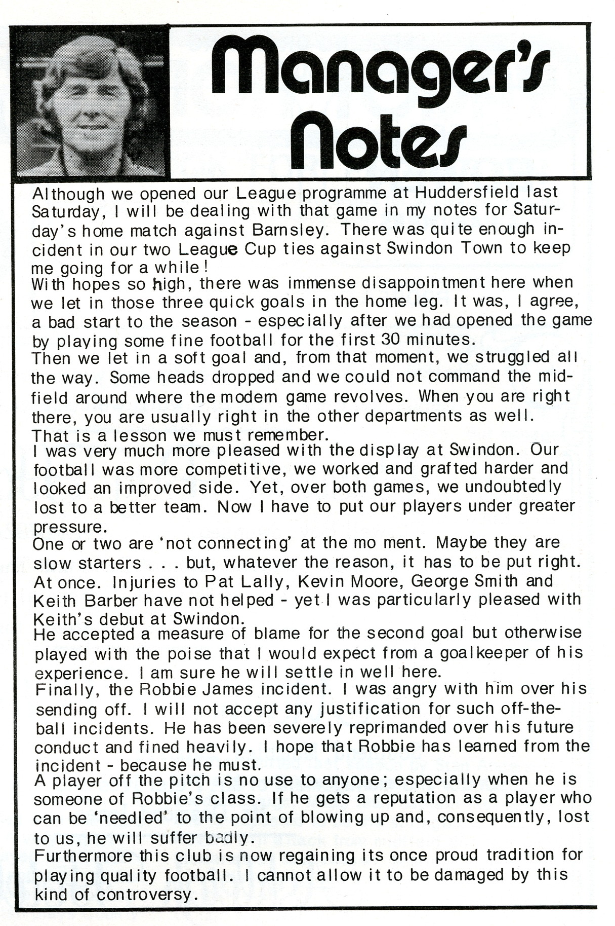 Manager’s notes from Swansea City match programme, 23 August 1977. Proof that players have not always had an easy time from their manager!
