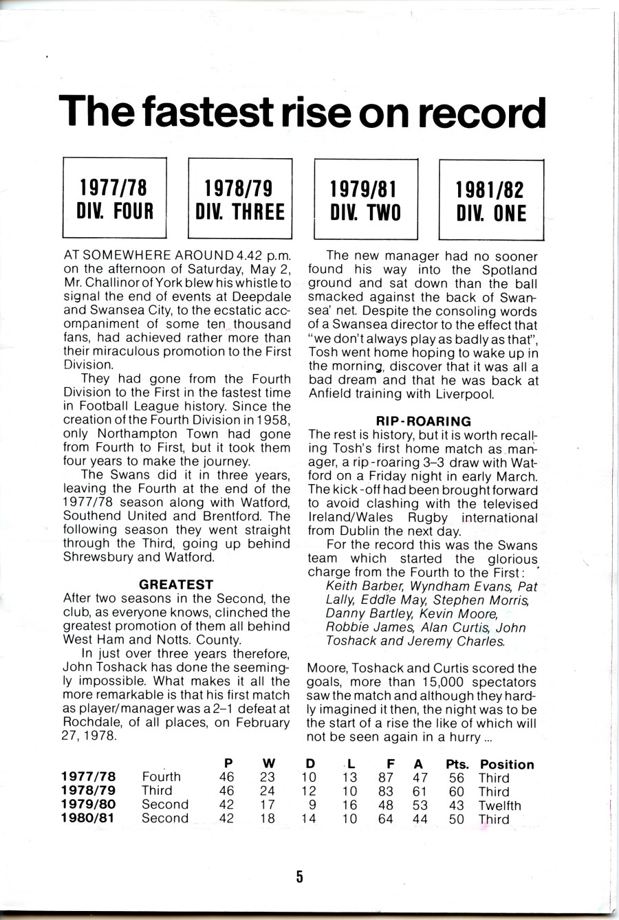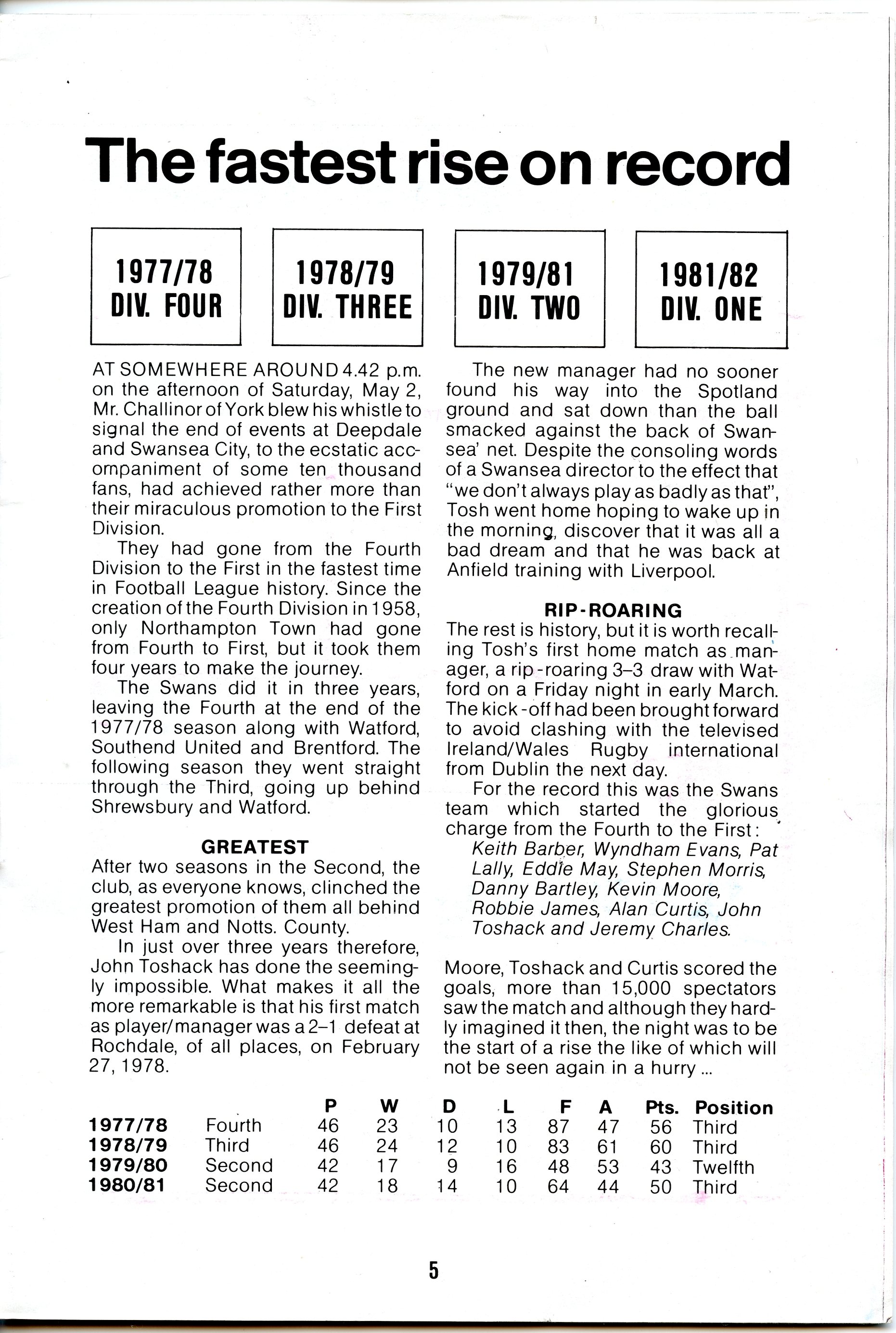 A record of Swansea’s rise from the 4th to the 1st Division.